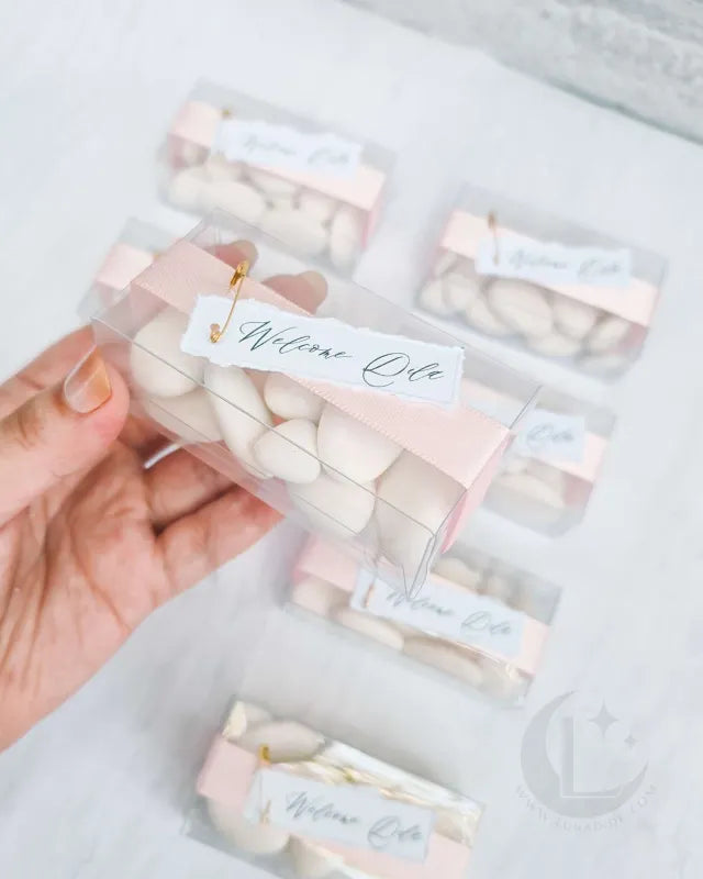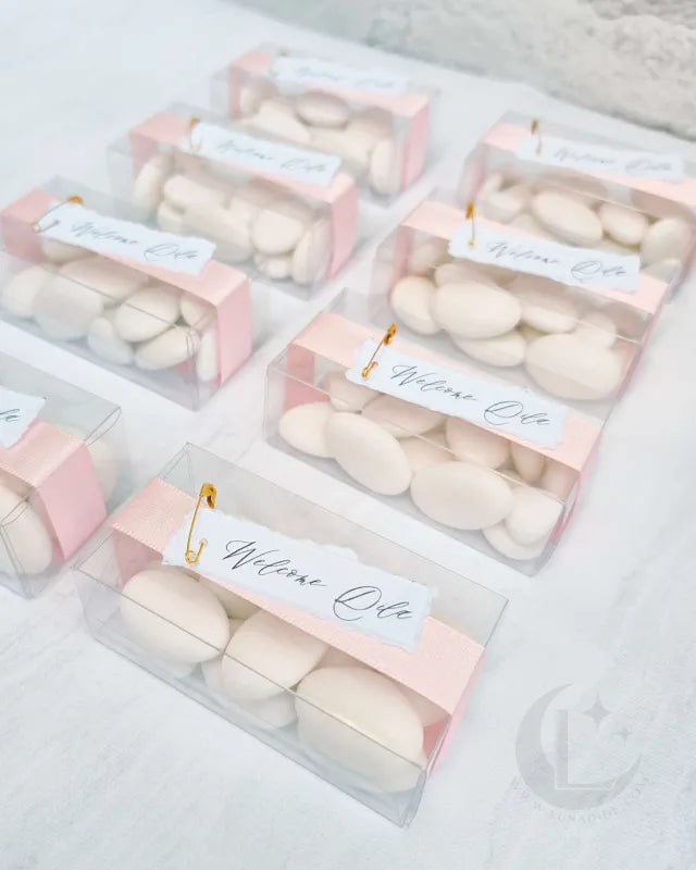 ✦ Transparant doosje (4 x 8 x 2 cm) gevuld met witte ovale en hartvormige dragees. Afgewerkt met een satijnen lint in een kleur naar keuze en een label, bevestigd met een gouden mini veiligheidsspeld.