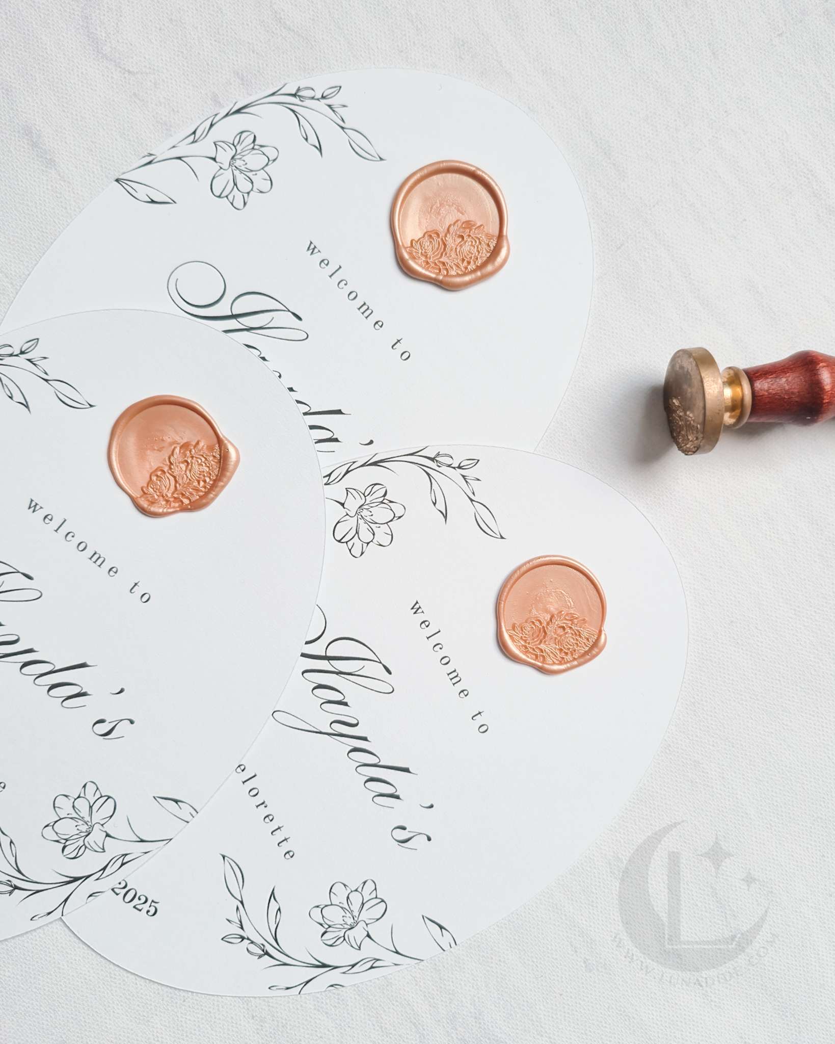 ✦ Stevige kaart van 14.8 x 21 cm uitgesneden in een ovale vorm. Afgewerkt met een waxzegel, ontworpen door Lunadide.