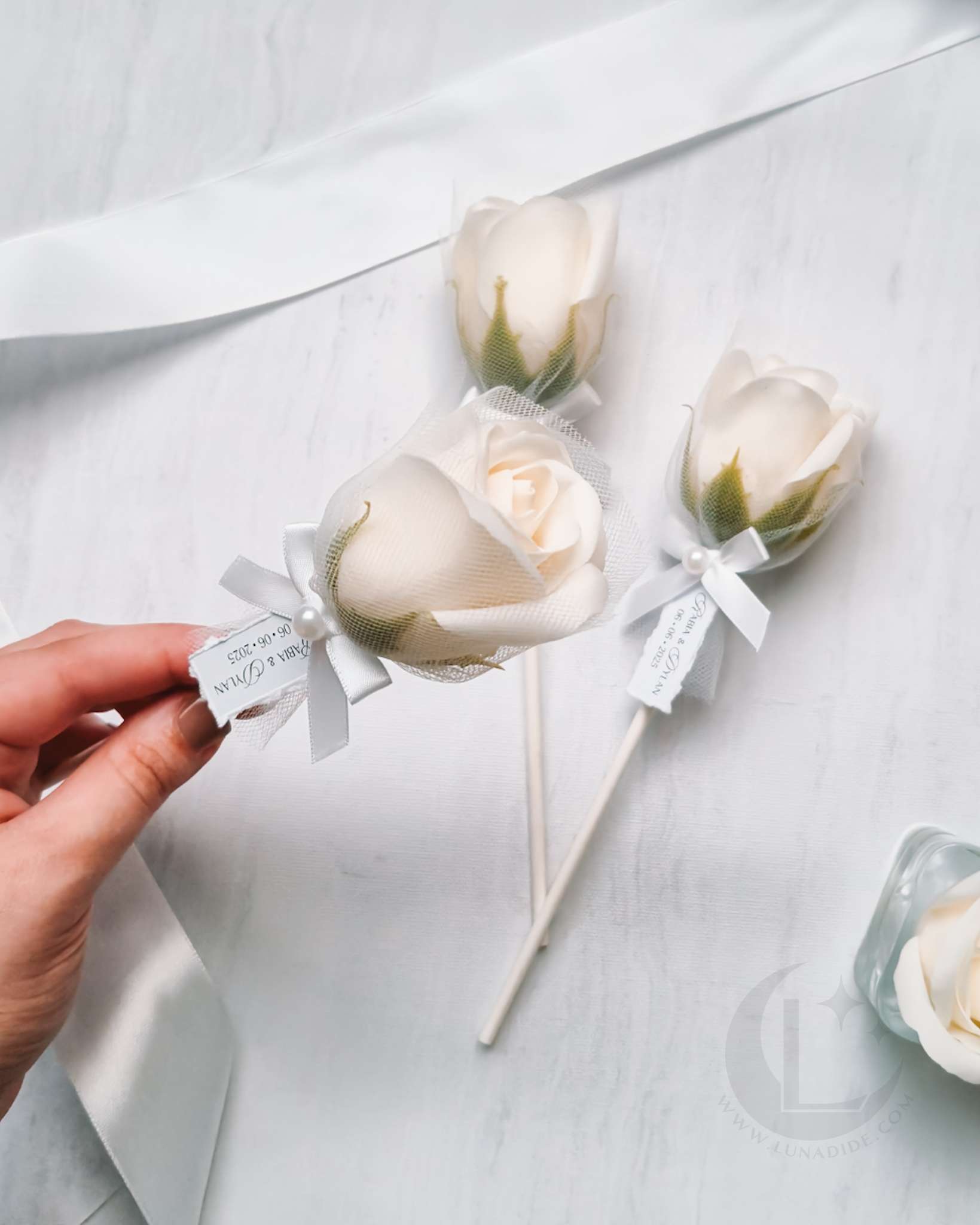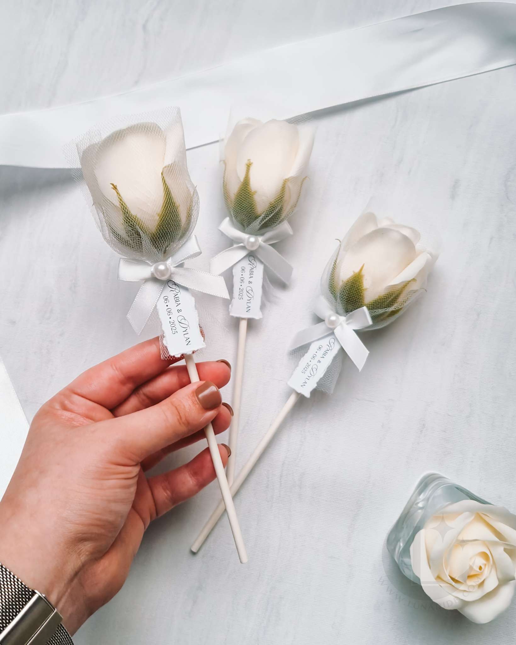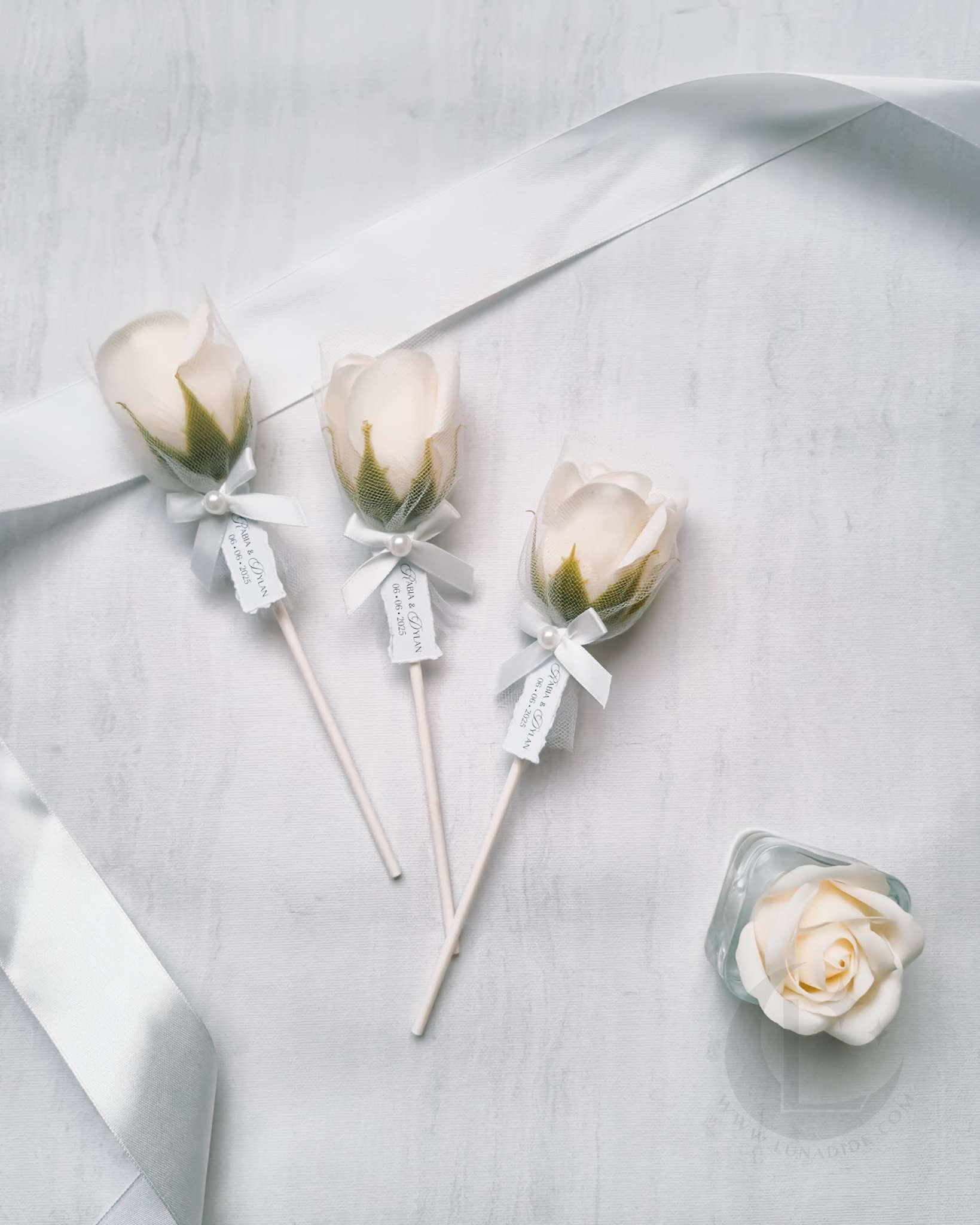 ✦ Een zeeproos in een gebroken witte kleur afgewerkt met een elegante tulle wrap, naamkaartje en een strikje met een parel detail.