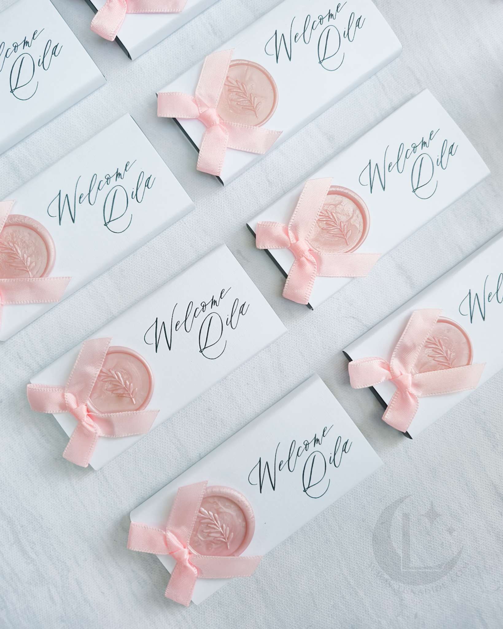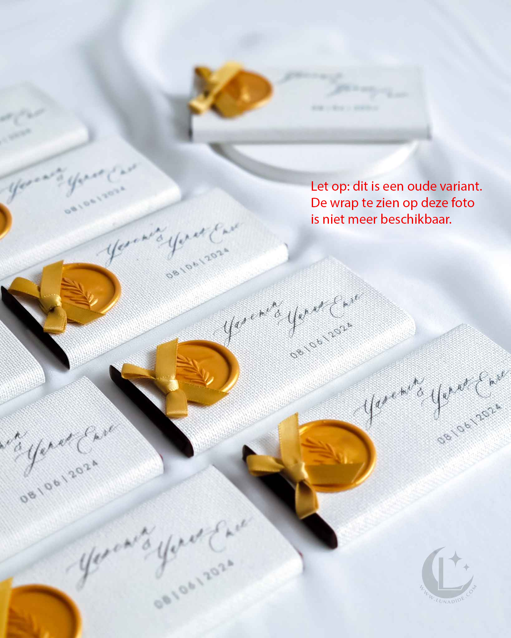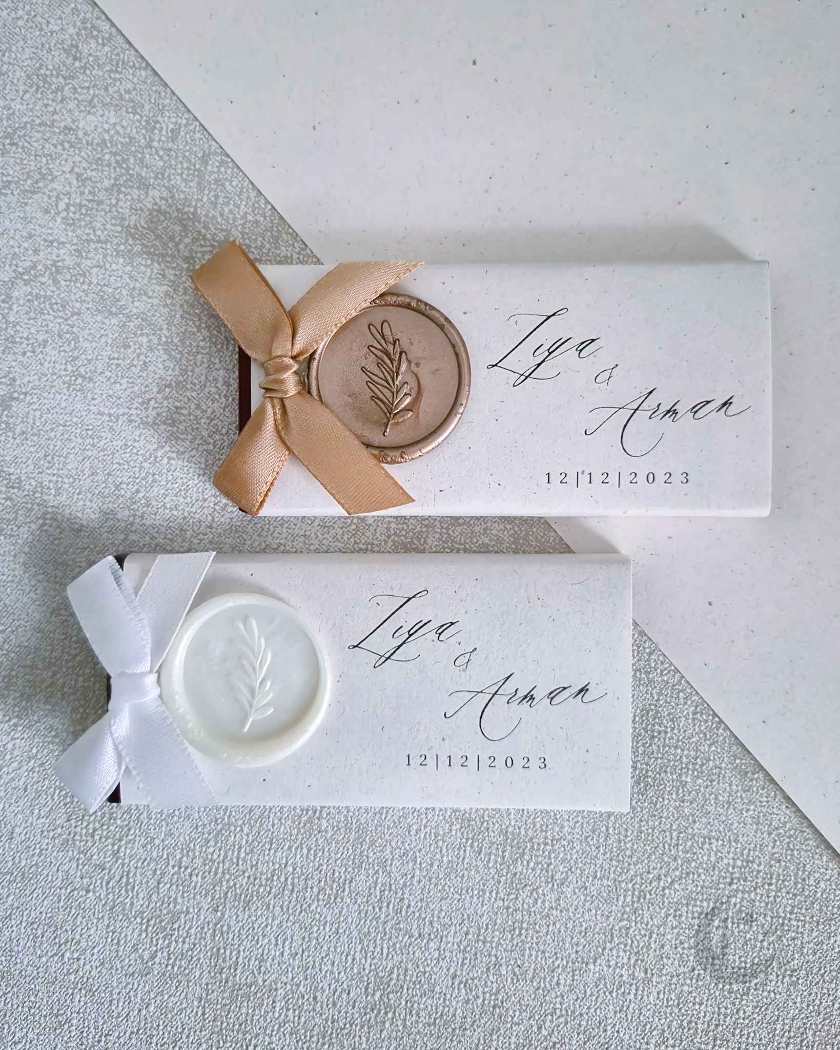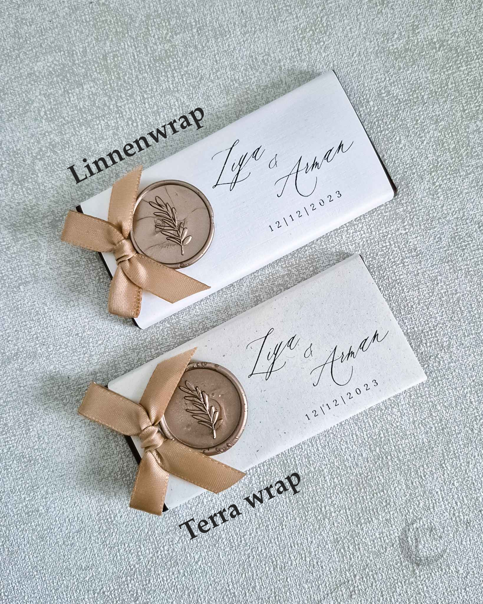 ✦ Mini pure chocoladereep (70%, 4,5 x 9,5 cm). Verpakt in luxe terra- of linnenpapier met een stijlvolle bedrukking, afgewerkt met een waxzegel met een olijftakillustratie in een kleur naar keuze en een bijpassend satijnen strikje.