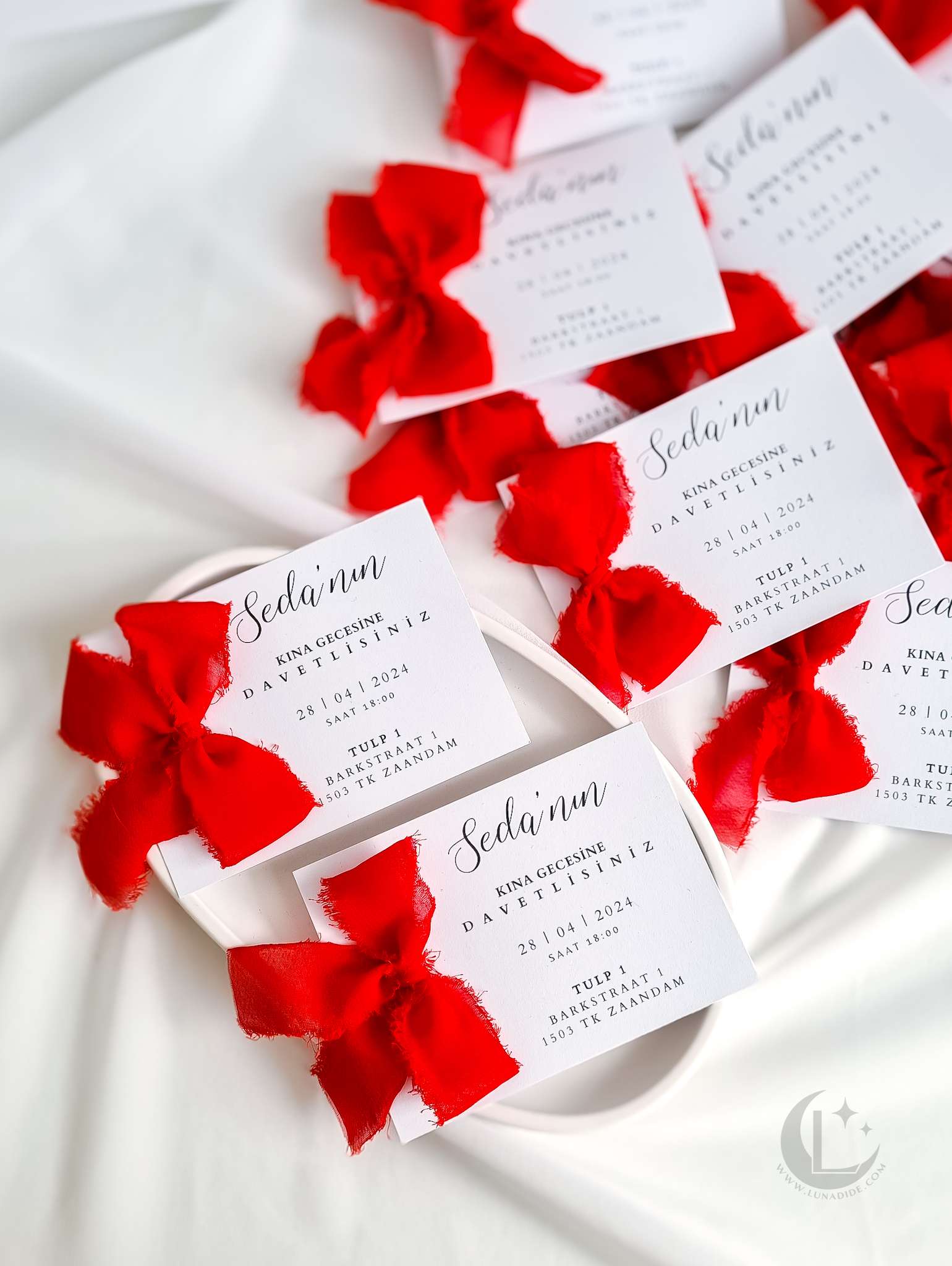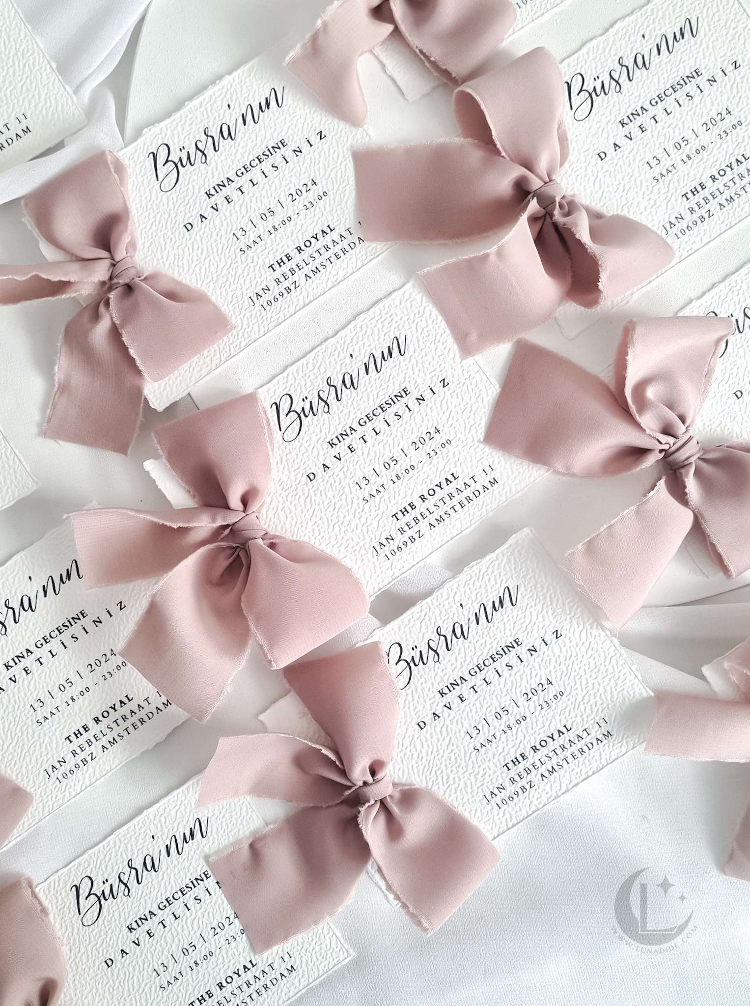 ✦ A7-formaat kaart (10,5 x 7,4 cm), bedrukt met jouw uitnodigingsdetails. Keuze uit glad papier of textuurpapier met ruwe randen. Afgewerkt met een strik in een kleur naar keuze.