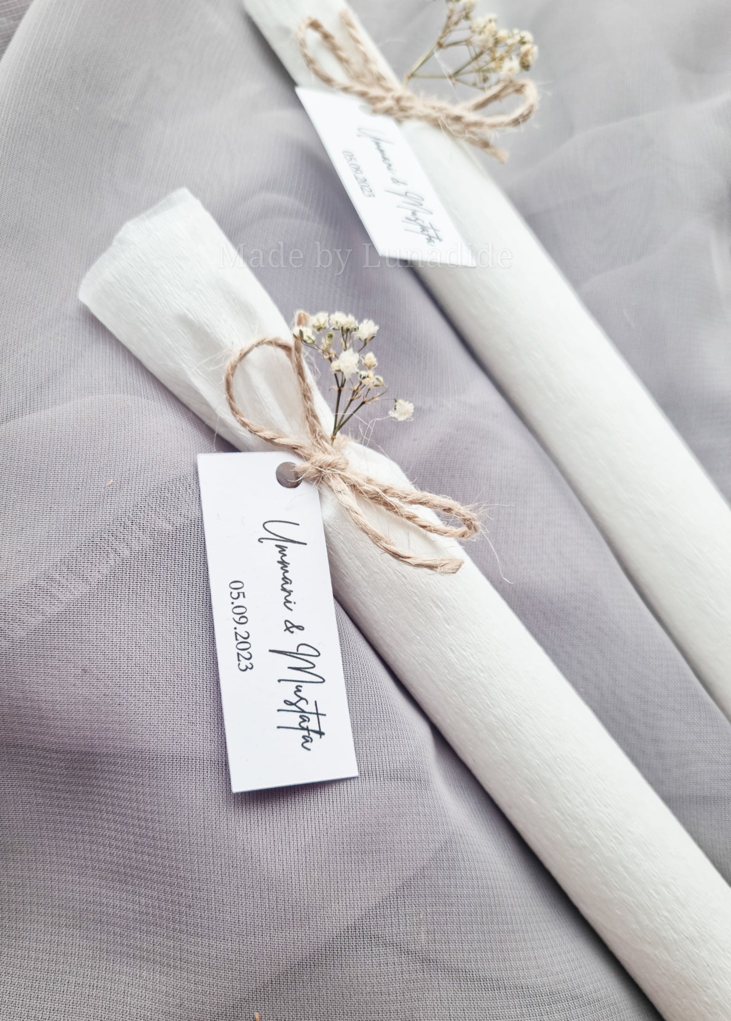 ✦ Witte kaars in een crêpetextuur wrap, ongeveer 25 x 3 cm. Afgewerkt met natuurtouw, gipskruid en een gepersonaliseerd label.