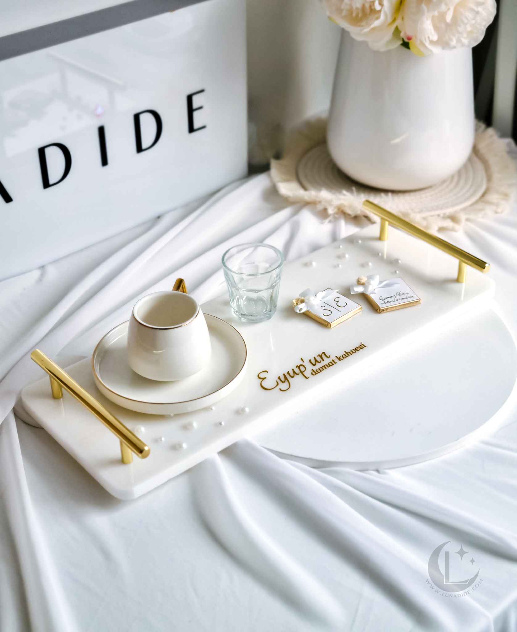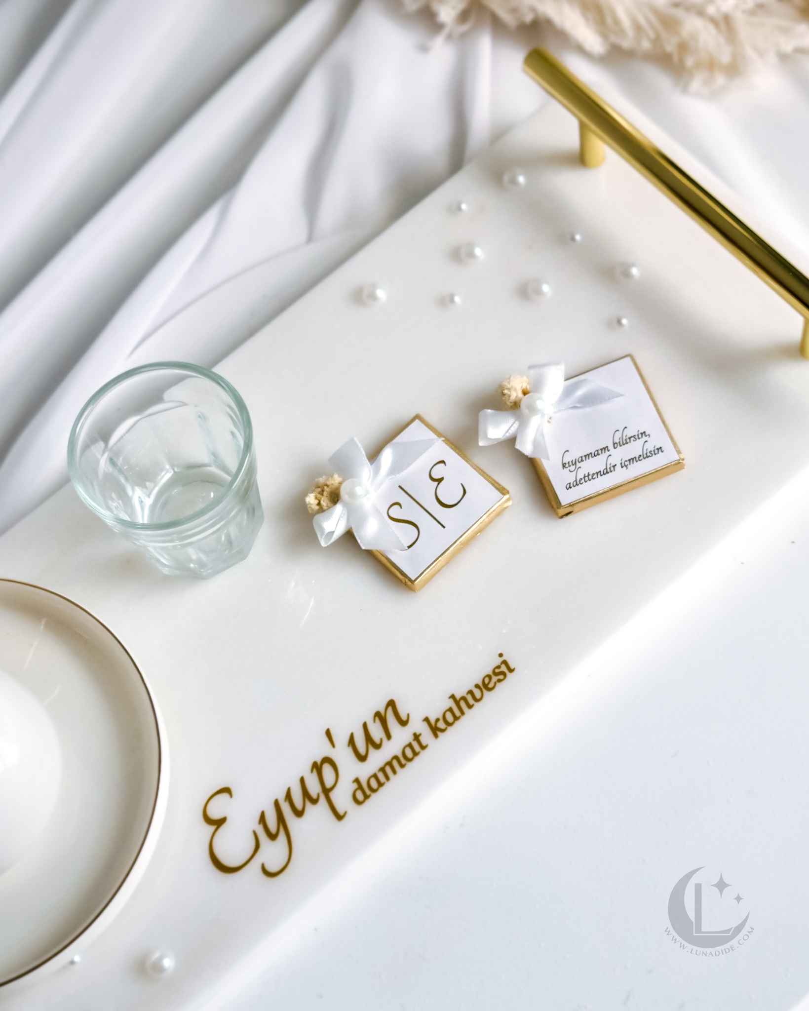 ✦ Inclusief het elegante Saturn koffiekopje van Karaca met gouden accenten, een klein waterglaasje en twee mini chocolaatjes, verfijnd versierd met gipskruid en een parel.