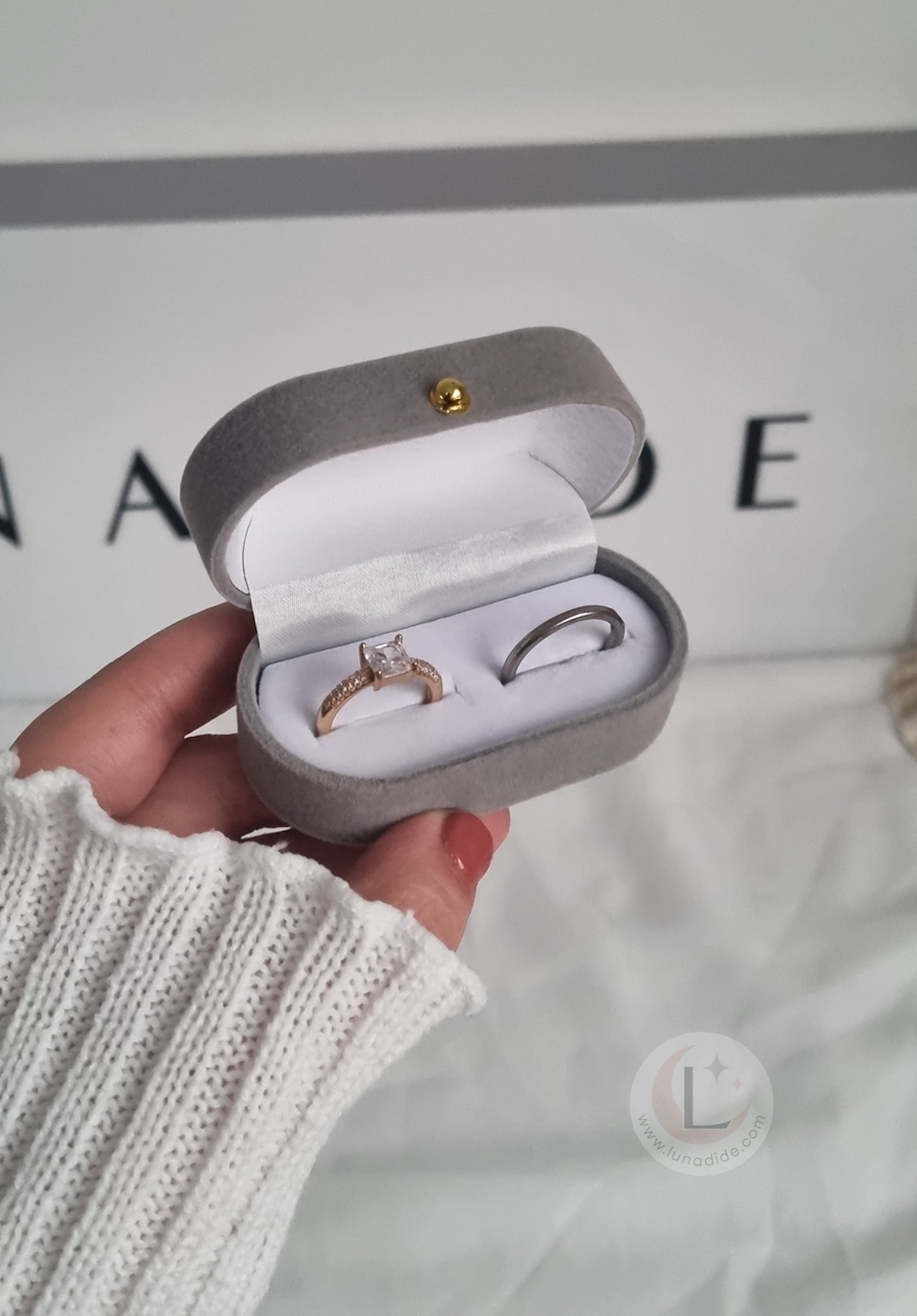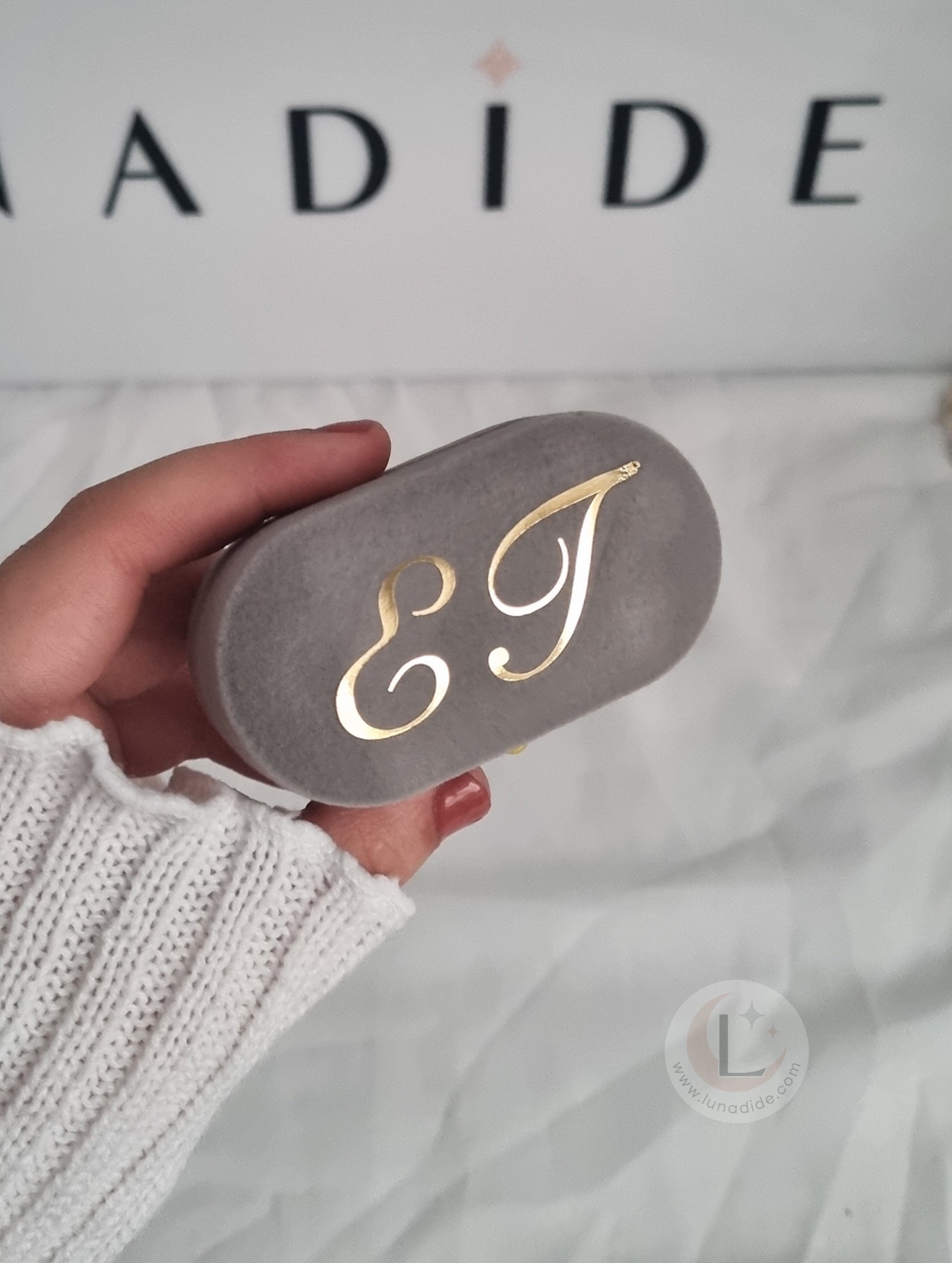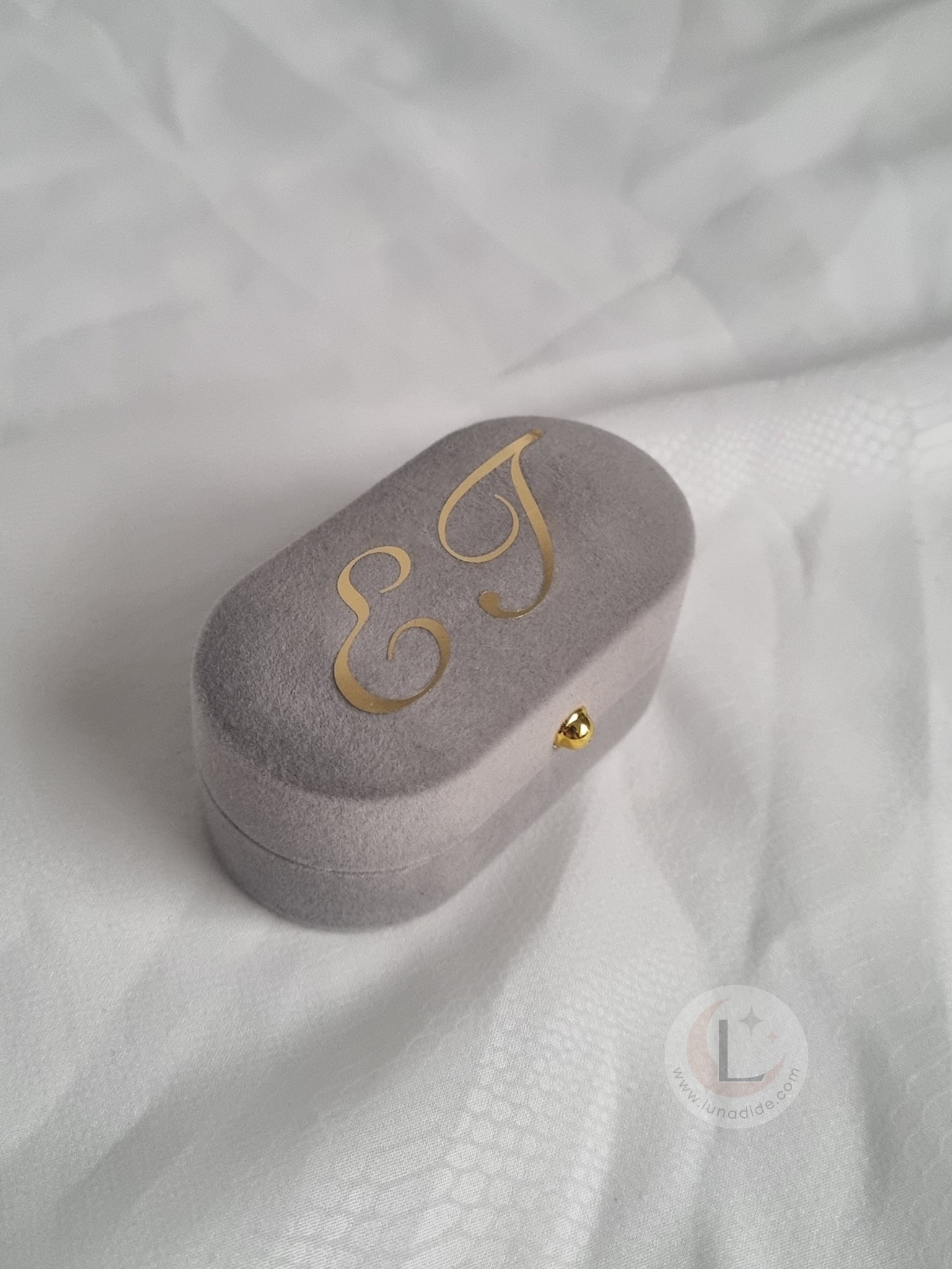 β¦ Ringendoosje suede grijs of bordeaux met initialen bedrukking.
